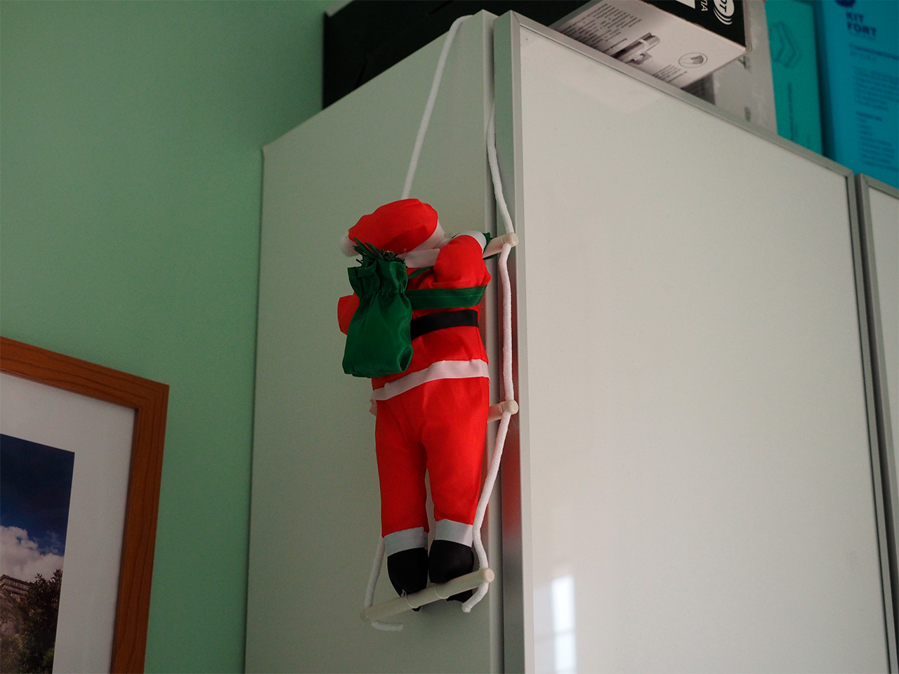 Вот и у меня Санта-Клаус лезет на шкаф. Когда найду и прикуплю большого - будет лезть снаружи на террасу. Прикольная традиция, уже полгорода такими увешаны: лезут в окна и на балконы. Еще и три короля иногда встречаются - тоже лезут с подарками.