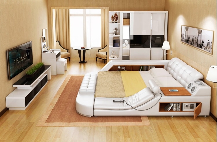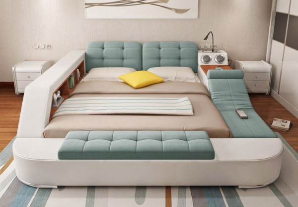 Посмотрите, какую шикарную кровать (англ.) тайская компания выпустила для азиатского рынка! Полки, поднимающийся столик для ноута и гаджетов, шкафчик, сейф, два динамика, лампа, розетка и USB-порты. Плюс - массажное кресло. Матрац поднимается, под ним можно хранить постельное белье и подушки.