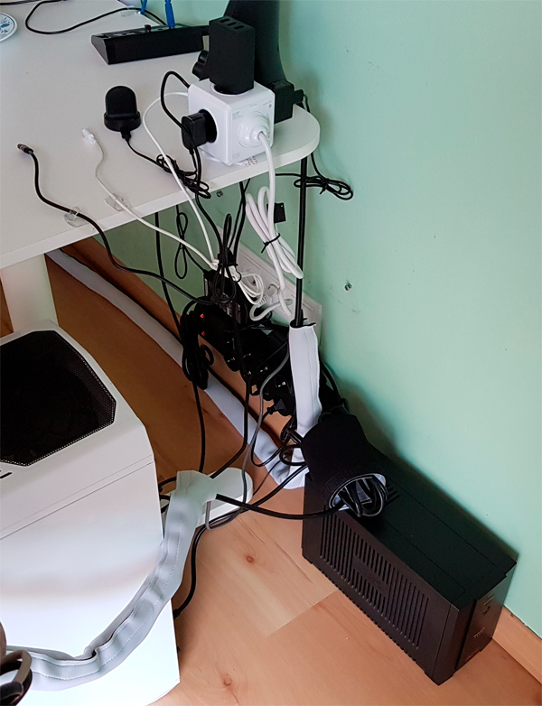Первая попытка организации проводочков из состояния стихийного бедствия во что-то более или менее пристойное. Еще не все виды органайзеров приехали, но вот как-то так. Задача сделать эстетически нечто прекрасное не стояла ни разу, а вот лишнее поубирал и теперь реально можно нормально протирать пол. Что и требовалось доказать.