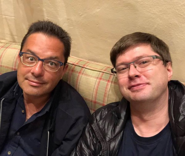А вот мы с Вильяновым перед презентацией - селфи на смартфон Вильянова. Серега при этом так упорно требовал, чтобы я смотрел в глазок камеры, что у меня один глаз направлен в глазок, а другой - на кнопку "Home". Прикольно получилось.