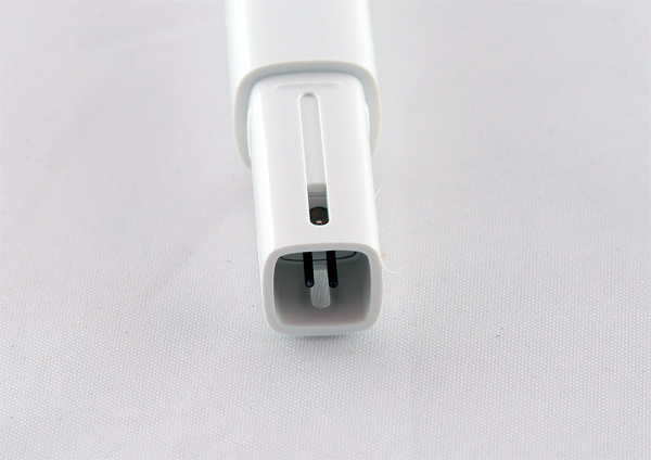 В верхней части под снимаемой крышкой находятся две круглых батареи. В нижней части под пластиковым колпачком находятся два титановых щупа. Также тестер имеет датчик температуры - для компенсации результатов измерения, как объясняет производитель.