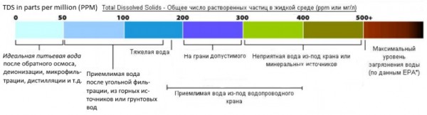 TDS (Total Dissolved Solids) - это примеси, содержащиеся в воде. Устройство измеряет их количество. Как оценивать результаты? Вот по этой шкале.