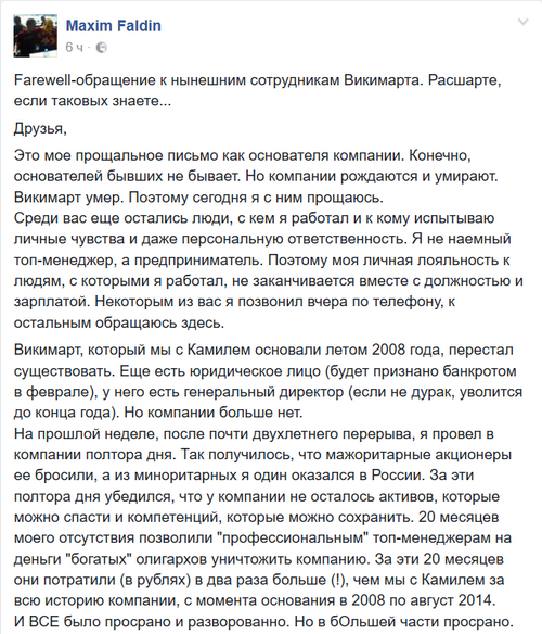 И вот как раз вчера Максим опубликовал у себя в Facebook любопытное сообщение, вот его начало.